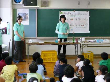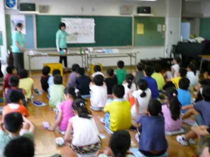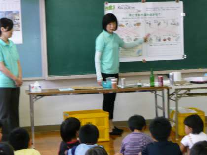 2クラス合同でエコプラザの方に来ていただき、授業を行いました。どんなものがリサイクルをされて、何になるのか、ということを話しています。