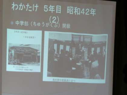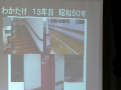 わかたけ学級の今日までのあゆみについて、写真を見ながら知りました。今年は校舎のエレベーターが新しくなりました。