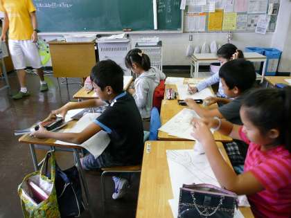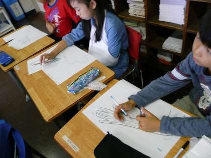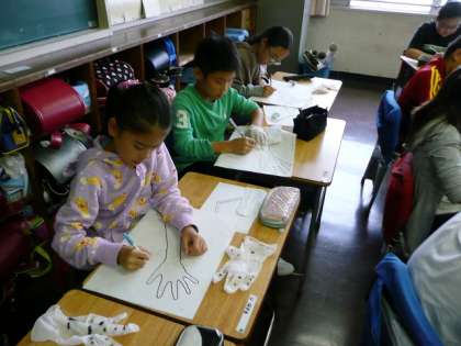 「人の体のつくりと動き」の学習です。腕の絵と自分の腕を見比べながら、曲がるところはどこか書き込んでいます。