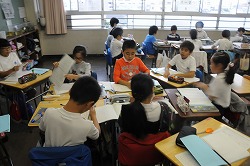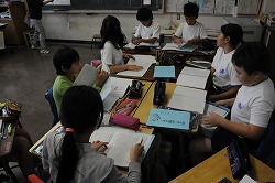 討論会を班ごとに行っています。それぞれ役割を分け、聞き手と話し手で気づいたことや良いところ、直した方がいいところなどを記録シートに書き込みます。