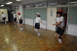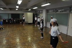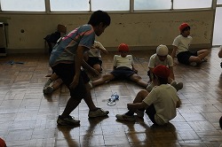ストレッチを行い、なわとびマスターの出場者を決めています。