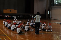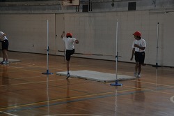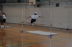 高跳びの練習をしています。それぞれの記録ごとに分かれ、記録が良くなるためにはどのような工夫が必要か先生から話を聞いています。