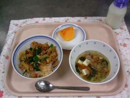 今日の給食は、キムチ丼・豆腐とわかめのスープ・くだもの(柿)・牛乳でした。