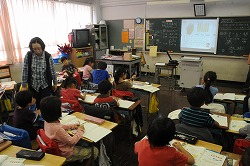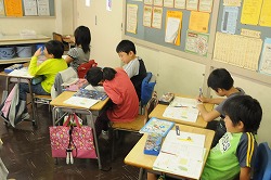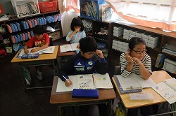 テープを使ってかけ算の問題を解いています。また、文章問題で答えの書き方などに注意しながら解いています。