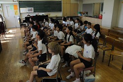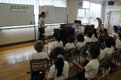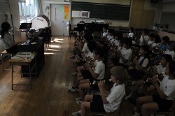 リコーダーの練習をしてます。ソ・ラ・シ・ドの指使い、音を鳴らすタイミングを周りの友達とそろえながら行っています。