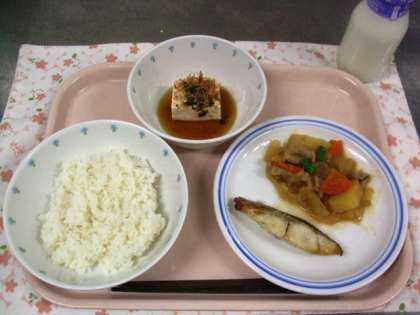 今日の給食は、ご飯・ほっけの塩焼き・肉じゃが・湯豆腐・牛乳でした。