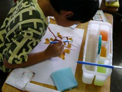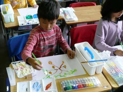 「らっかせい」をよく観察して、絵の具を使って描いています。じっくりと見ながら、丁寧に筆を進めています。