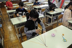 ミサンガ作りをしています。糸と糸の結い方をに気をつけて模様などを崩さず作り上げています。