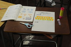 二等辺三角形と正三角形の形の特徴から組み合わせることでどんな形が生まれるのか厚紙や方眼紙を使い考えています。