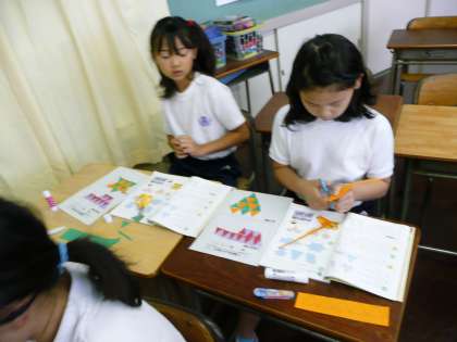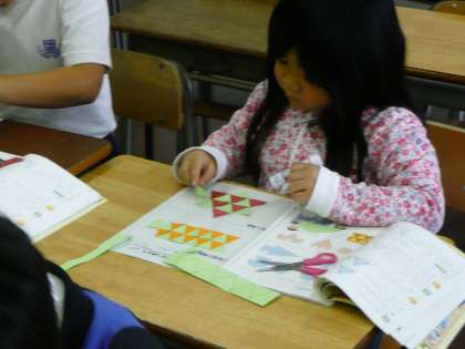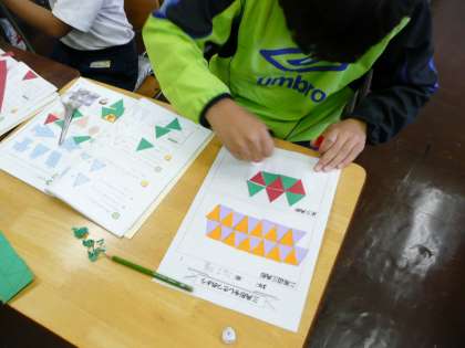 説明を聞いた後に、ペアの友達と三角形を交換し、しきつめに挑戦しています。