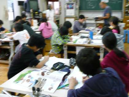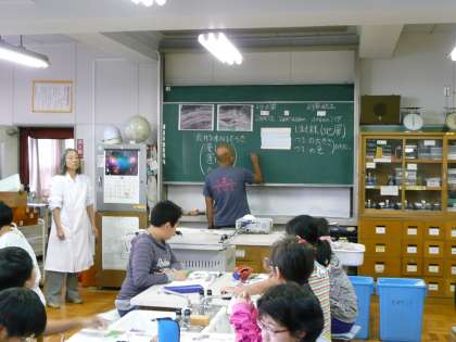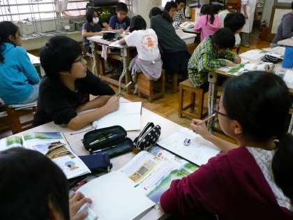 「流れる水のはたらき」の学習です。教科書や黒板の写真を手がかりに考えを深めています。