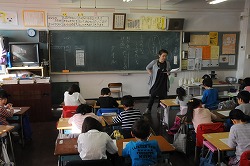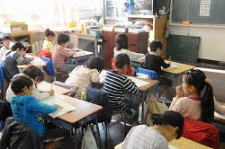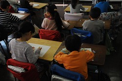 先生のいった言葉をプリントに書き、つなげて一つの文章を作っています。