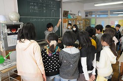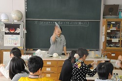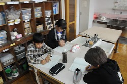 水のはたらきによって土、砂利、石がどのように積み重なるか実験をしています。
