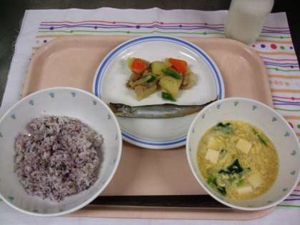 今日の給食は、ゆかりご飯・焼きししゃも・塩肉じゃが・かきたま汁・牛乳でした。
