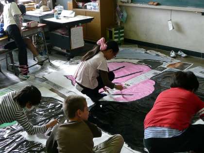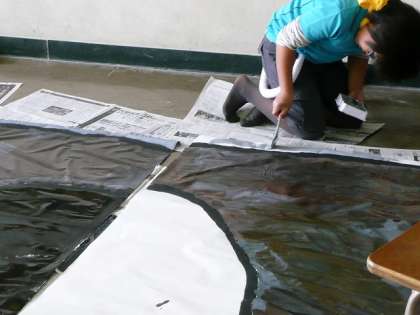 背景の色塗りを行っています。また、衣装を着けて、せりふ合わせも行っています。