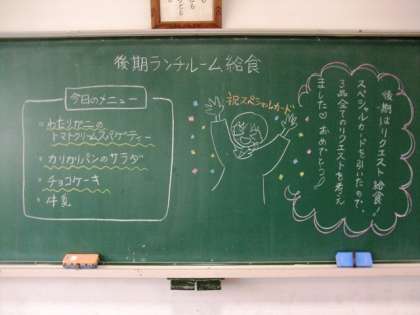 今日の給食は、5年2組のリクエストランチルーム給食でした。メニューは渡り蟹のトマトクリームスパゲティー・カリカリパンのサラダ・チョコケーキ・牛乳でした。