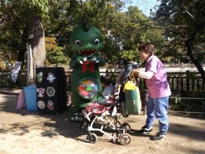 公園には、目黒区のゴミ減量キャラクターの「ゴミラス」くんたちが来ていて、一緒に写真を撮りました。
