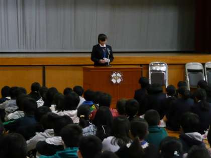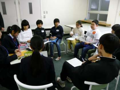 今年の四中校区のテーマは「勇気」です。 本校6年、不動小学校6年、第四中学校2年生全員が集まり、20グループに分かれて話し合いました。