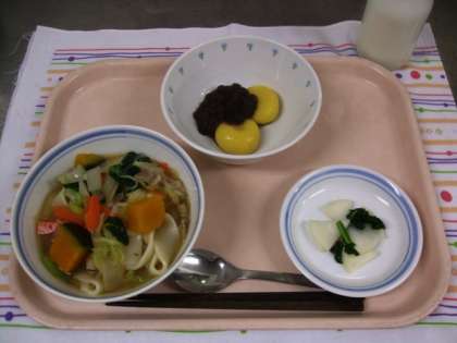 今日の給食は、ほうとう・かぶの甘酢漬け・かぼちゃの白玉ぜんざい・牛乳でした。