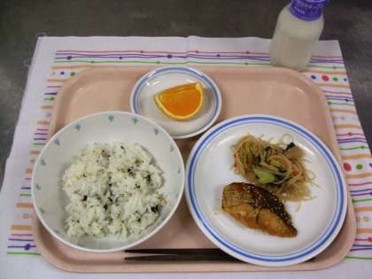 今日の給食は、わかめご飯・鰆のみそ漬け焼き・ビーフンソテー・果物(スイートスプリング)・牛乳でした。