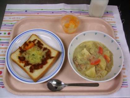 今日の給食は、ごぼうピザトースト・あすかチャウダー・サイダーゼリー・牛乳でした。