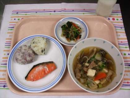 今日の給食は、おにぎり(ゆかり&わかめ)・鮭の塩焼き・のり和え・いも煮汁・牛乳でした。