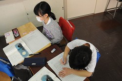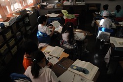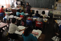 「たぬきの糸車」の書き取りをしています。他の人が読んでも分かるように行に文字を書く時に注意すべき事を先生から教わっています。