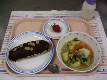 今日の給食は、エクレアパン・ポトフ・くだもの(さちのかいちご)・牛乳でした。