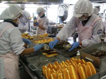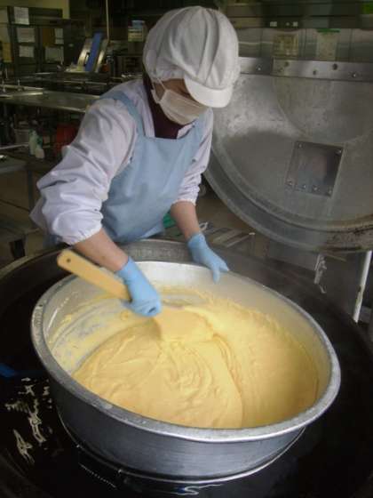 今日は一足早いバレンタインメニューでした。(明日は6年生が遠足のため)年に1度のエクレアパンは、子ども達に大人気のメニューです。給食室特製のカスタードをパンにはさみ、チョコをかけてアーモンドを飾ります。作ったカスタードの量は約20kg!大きなたらいを使い、ダマにならないように慎重に作るのはまさにプロの技です。