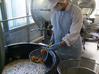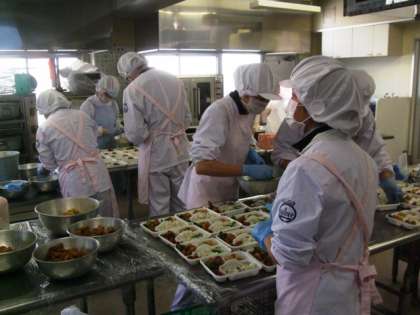 お弁当箱に詰めるためには早く調理をしなければいけません。そのため給食室は朝から大忙しで、調理師さんたちはいつもより1時間から30分も早く来て作ってくださいました。