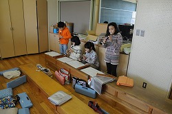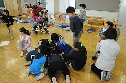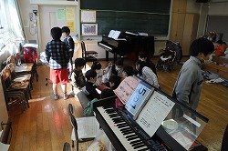 わかたけ学級と交流をしています。さまざまな楽器を使い、音を出しています。