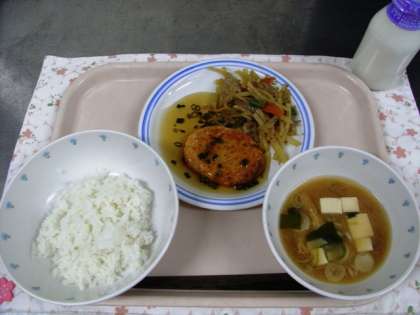 今日の給食は、ご飯・鮭のつくねハンバーグ・じゃがいもの金平・豆腐とわかめのみそ汁・牛乳でした。