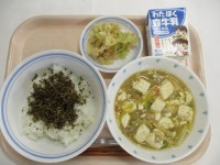 麻婆豆腐丼・いも団子汁・果物(りんご)