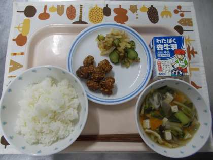 ごはん・カツオのごまみそ揚げ・土佐酢和え・けんちん汁