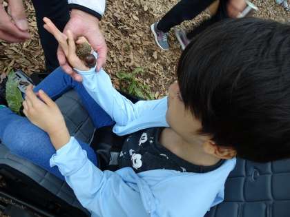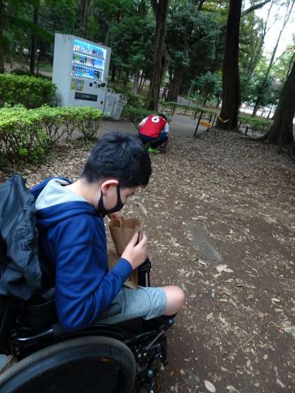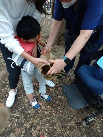 林試の森公園へ行きました。丸いもの、細長いもの、いろいろな形のどんぐりを見付けました。どんぐりや落ち葉を拾い、たくさんの秋を見付けた後は、友達と一緒に遊具で遊び、楽しく活動しました。