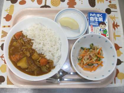 カレーライス・大根サラダ梅肉ソース・果物(りんご)・牛乳