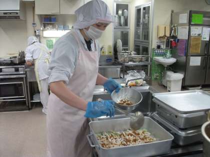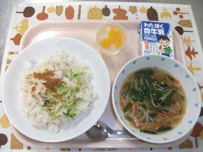 今日はシンガポールの海南鶏飯を作りました。シンガポールは朝・昼・晩3食全てを外食する事もあるほどの外食文化。家で食べる時も作ることはせず、買ってきたものを食べることが多いそうです。街には「ホーカーセンター」といわれる屋台村があり、そこで人気なのが海南鶏飯です。ごはんと鶏肉を一緒に炊き、野菜も合わせて混ぜて食べます。おいしいシンガポールの国民食です!サイダーゼリーは3−1・3−3のリクエスト給食。油面小で人気のデザートです。