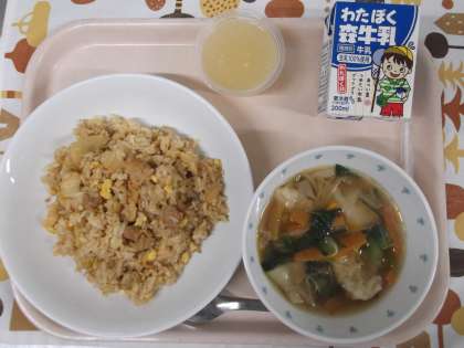キムチチャーハン・ワンタンスープ・すりおろしりんごゼリー・牛乳