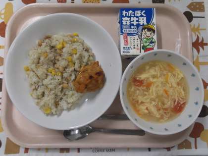 スープには生のトマトの皮をむいて角切りにしたものが入っています。今日はわかたけ2組が生活科でトマトについて学んだのでちょうど良いメニューでした。