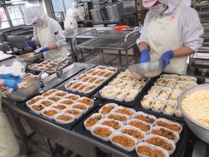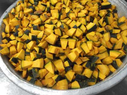 ポタージュは、かぼちゃの皮を除いた方がきれいな黄色でなめらかになるのですが、皮にもカロテンなどの栄養素が多いこと、ごみとして捨てたくないことから一緒にミキサーにかけました。かぼちゃの味が濃くでていました。人気があってとてもよく食べていたのですが、数人は「かぼちゃが苦手なんです」といって苦戦している姿も見られました。