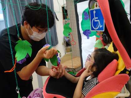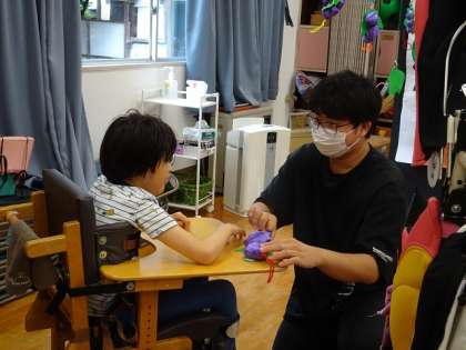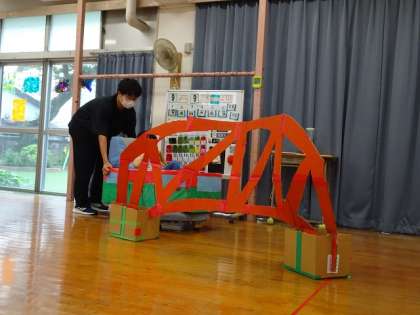 「でんしゃでいこう でんしゃでかえろう」のお話を読みました。ぶどう狩りや電車に乗る活動を通して、言葉のもつ音やリズムに触れたり、数への関心を高めたりしています。