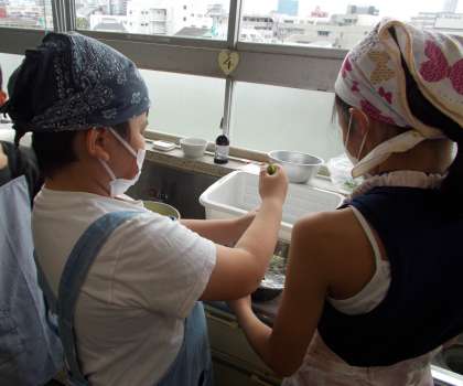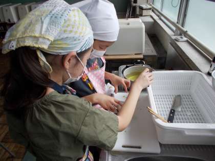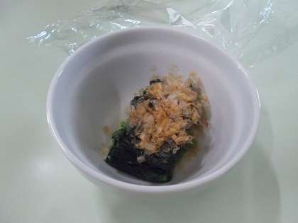 家庭科で初めての調理実習を行い、ほうれん草のおひたしを作りました。