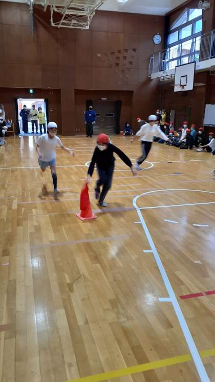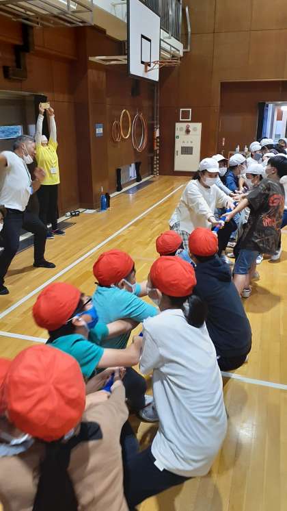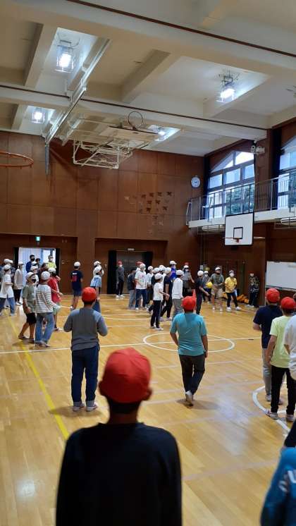雨天のため、予定を変更し、屋内運動場で屋内運動会を行っています。