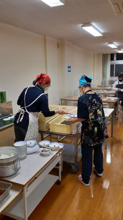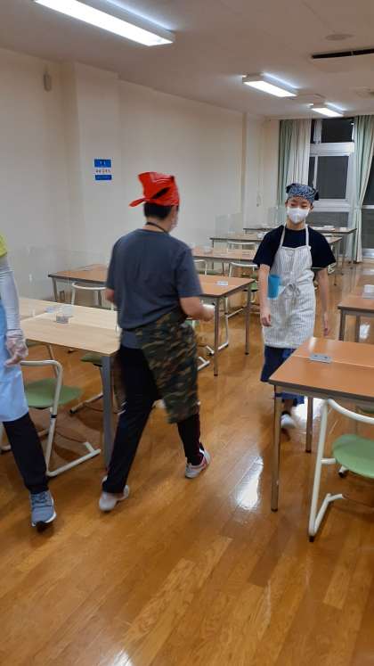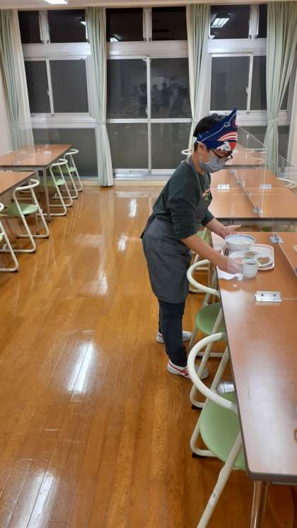 食事係が夕食の準備をしています。