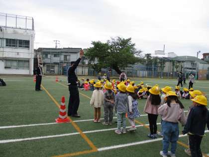 交通安全についてのお話を聞き、その後、横断歩道の歩き方を実際に行いました。