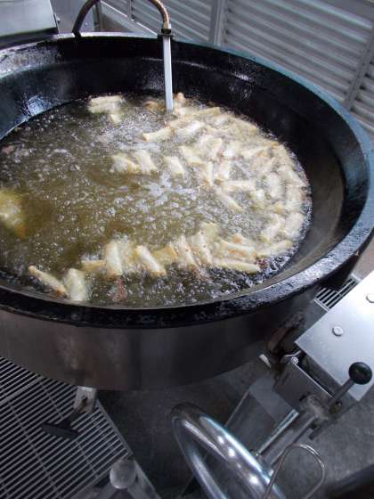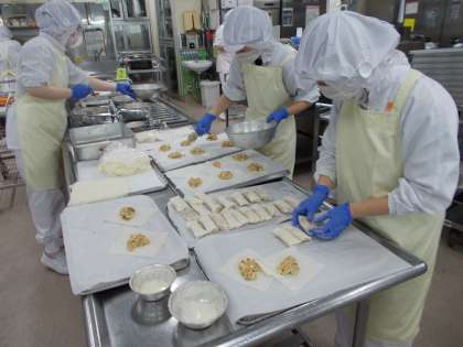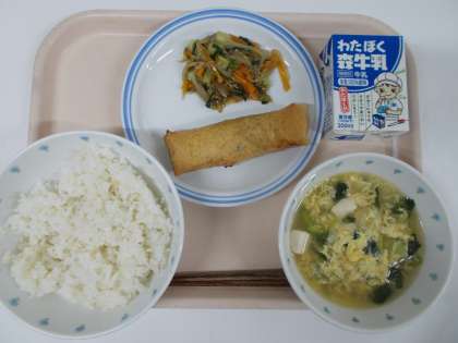 豆腐をゆでて水分を絞り、干し椎茸やえび、チーズを入れて春巻きにしました。外はカリっと、中芯はやわらかく豆腐とチーズが合わさったなめらかな食感になりました。豆腐やチーズ、炒め物にじゃこを使っているので、カルシウムたっぷりメニューでした。放送でカルシウムの話をしたところ、2年生が「カルシウムが1番多い食べ物はどれ?」「毎朝牛乳飲んでいるから、僕の骨は強いよ!」「ヨーグルトを毎日食べているよ」などと話していました。