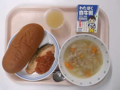黒糖パン・鮭のオニオントマトソース・ABCスープ・すりおろしりんごゼリー・牛乳