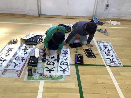 4年生の書き初めの様子です。友達が見守る中、集中して取り組んでいますね。