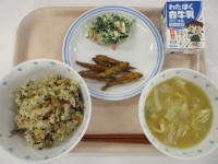 12月18日 ひじきご飯・わかさぎの甘露煮・ほうれん草の白和え・みそ汁・牛乳
