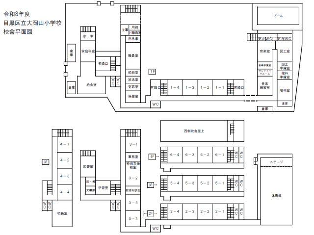 北校舎:校長室・職員室・事務室・主事室・家庭科室・図書室・多目的室・教育相談室・PTA室・3,4年生の教室